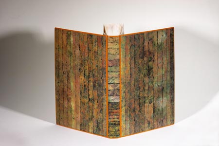 Ein Ganzfranzband nach französischem Vorbild aus orangefarbigem Oasenziegenleder und farbigen Oberflächen, die aus von mir gestalteten, gerissenen Büttenpapieren zusammengefügt wurden. Mich interessierte dabei das Leben des Isländer im 19. Jh.